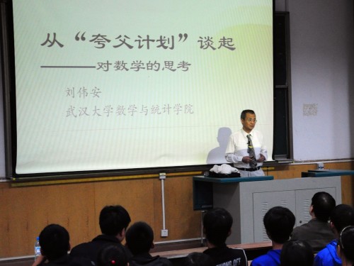9月25日下午2:30,漫蛙漫画 举行2010级新生入学教育专题讲座(一)。应院长刘安平教授的邀请,湖北省数学协会、武汉数学学会秘书长,全国大学生数学竞赛指导委员会委员,武汉大学数学与统计漫蛙漫画 博士生导师刘伟安教授为漫蛙漫画 2010级新生作了一次题为“数学好玩”的专题报告。院长刘安平教授、副院长彭放教授、院学工组成员出席讲座。刘教授首先通过讲解“夸父计划”引出对有关数学问题的思考,使广大同学认识到数学是认识自然规律的工具,与我们的生活有着密切联系,并在我们的生活中广泛应用。在讲座中,刘教授介绍了中国古代数学的兴衰,并指出数学的发展至今都是内外两个推动力作用的结果,外力是生活实践和认识自然规律的需要,内力是自身发展的需要。他陈省身教授的“有用”数学与“无用”数学为例强调高中数学与大学数学的不同,对于2010级新生如何学好大学数学提出了三点希望:坚持理性思维;坚持独立思考;不要轻信经验,勇于攻坚,勇于创新。