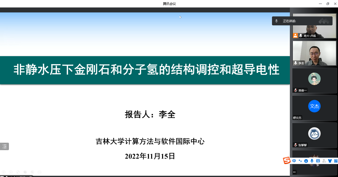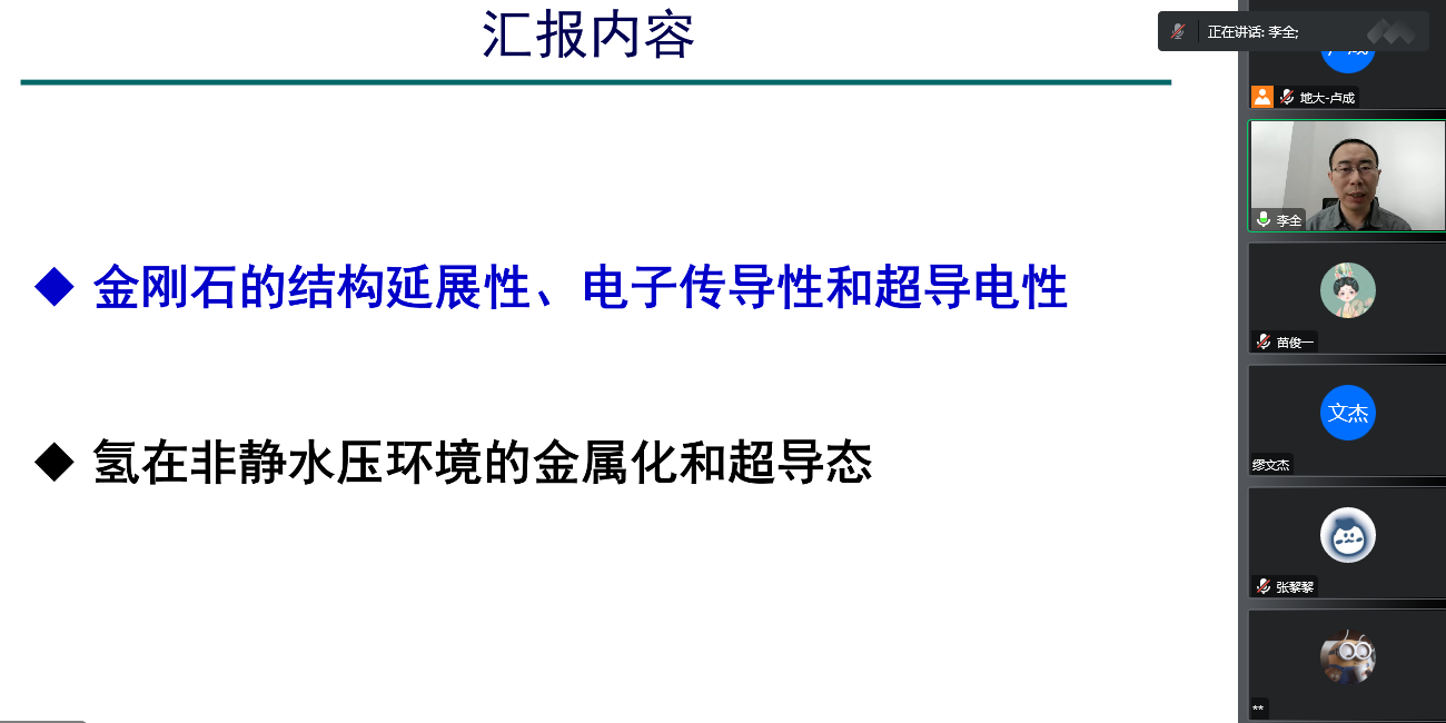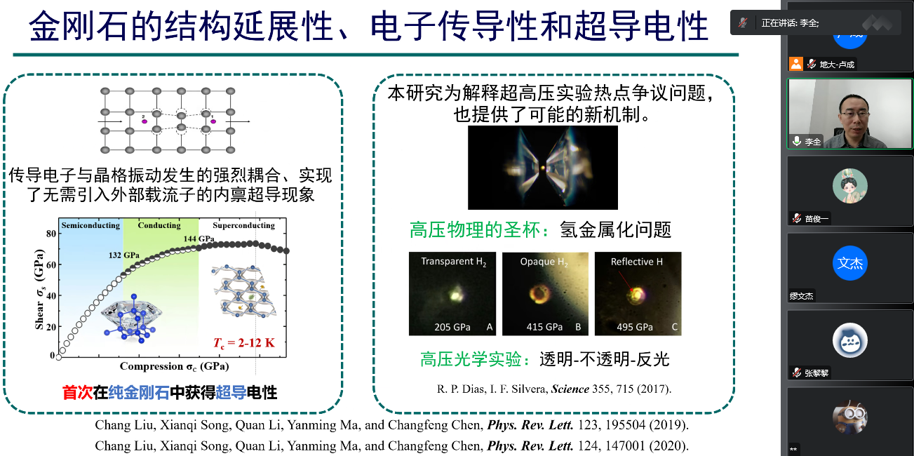 为迎接漫蛙漫画 七十周年校庆,11月15日上午,漫蛙漫画 通过线上的方式,邀请吉林大学计算方法与软件国际中心李全教授,为漫蛙漫画 物理系师生做了题为《非静水压下金刚石和分子氢的结构调控和超导电性》的学术报告。该报告由漫蛙漫画 科学技术发展院、漫蛙漫画 联合举办,卢成教授主持,漫蛙漫画 师生共计60余人参加。