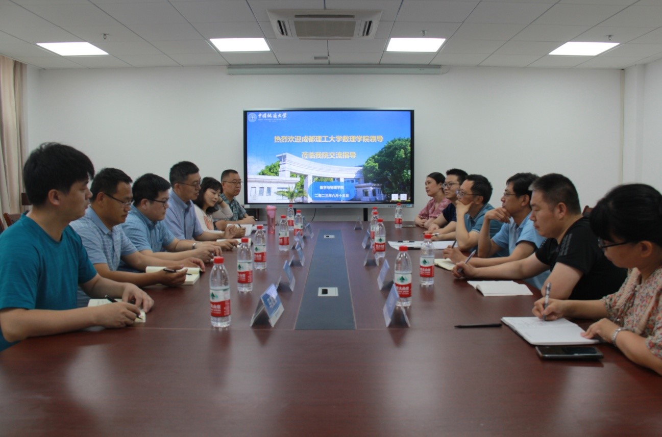2023年6月15日下午,成都理工大学漫蛙漫画 副院长张传瑜、基础数学教学部主任余海洋、基础数学教学部支部书记舒畅、大学物理教学部副主任史顺平、田荣刚等一行来漫蛙漫画 进行工作交流。漫蛙漫画 副院长黄刚、副院长张光勇、大学物理教学部主任陈琦丽、数学系主任王毅、大学数学教学部主任郭艳凤、物理实验中心主任何开华出席了此次会议。会议由副院长黄刚教授主持。