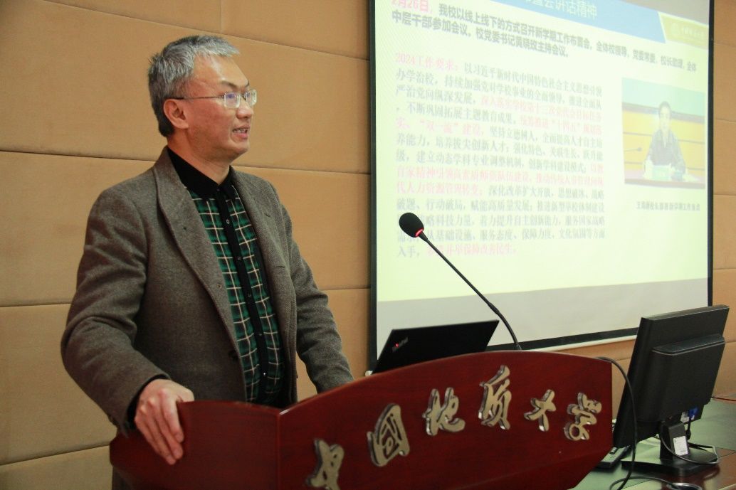接下来,院长郭上江传达了王焰新校长在春季新学期工作布置会上的讲话精神,介绍了学校2024年工作要点,并对漫蛙漫画 全年重点工作进行了安排部署。他要求全院师生要在认真落实学校工作要求的基础上,继续做好博士点申报后续工作,坚决打赢博士学位点建设的攻坚战,切实加强数学、物理公共基础课程建设,努力为建设地球科学领域国际知名研究型大学做出新贡献。