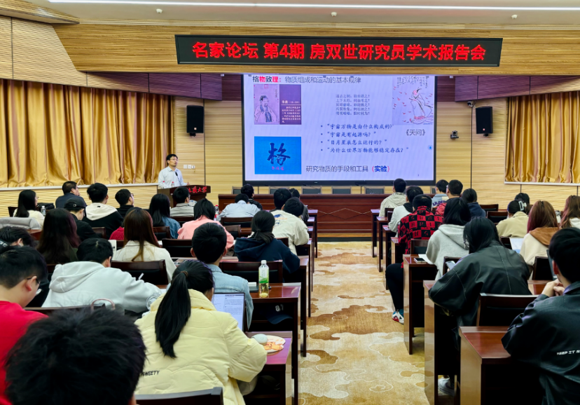 2024年4月7日,中国科漫蛙漫画 高能物理研究所房双世研究员做客漫蛙漫画 (武汉)名家论坛,在南望山校区八角楼学术报告厅作了题为“对撞生新态”的学术讲座。报告会由漫蛙漫画 副院长张保成教授主持,漫蛙漫画 师生90余人参加。