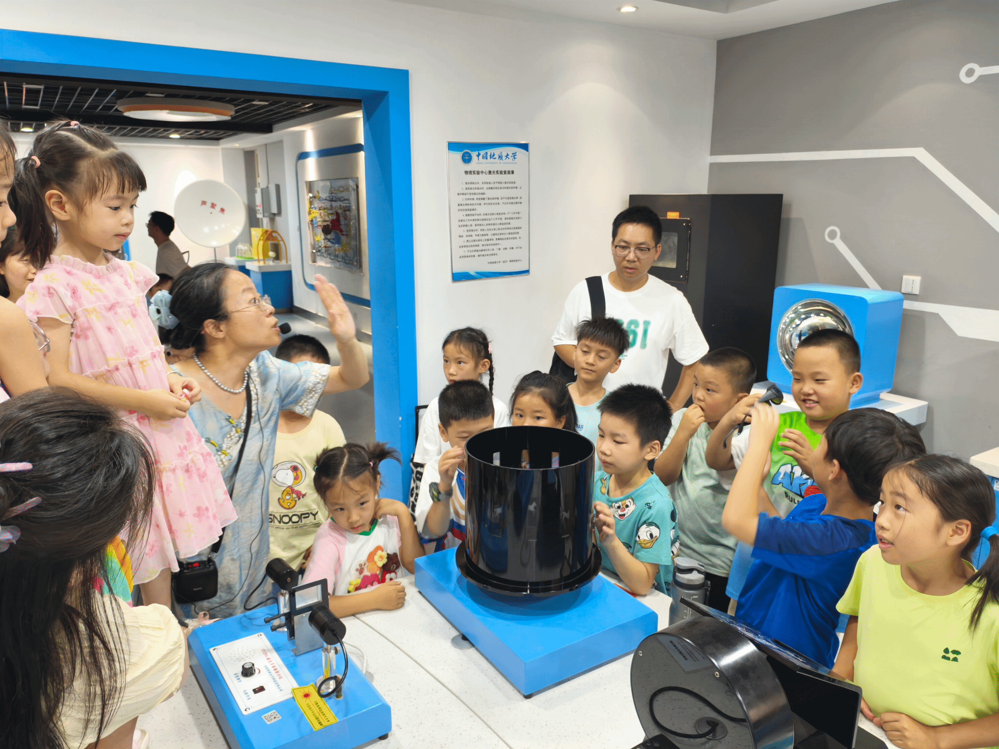 在电磁实验室,何开华教授化身“科学魔术师”,带领孩子们走进电磁的奇幻世界。雅各布天梯通电后,紫色电弧如火焰般逐级攀升,引得孩子们齐声惊呼:“好像会跳舞的闪电!”在音乐磁力线装置前,回形针在磁场作用下随音乐节奏“起舞”;辉光球中,蓝色电晕如星云般蔓延,当小手触碰玻璃表面,电流如灵蛇般追随指尖游走,孩子们兴奋地交换体验,感受电流的神奇。水力发电机与磁悬浮马达的联动展示,让孩子们直观理解了能量转换,“原来光能让小马达飞起来!”一个孩子指着悬浮转动的马达惊叹道。