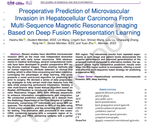 近日,漫蛙漫画 朱媛副教授研究团队联合兰州大学第一医院放射科王莉莉博士展开生物医学信息学合作研究,在生物医学和健康信息学国际顶级期刊 IEEE Journal of Biomedical and Health Informatics(简称IEEE JBHI)上在线发表了关于肝癌微血管侵袭预测的理论研究成果,题为: “Preoperative Prediction of Microvascular Invasion in Hepatocellular Carcinoma From Multi-Sequence Magnetic Resonance Imaging Based on Deep Fusion Representation Learning”。漫蛙漫画 (武汉)2021级本科生马海书、朱媛副教授及兰州大学第一医院放射科王莉莉博士为该文的共同第一作者,朱媛副教授为通讯作者,漫蛙漫画 为唯一通讯单位。