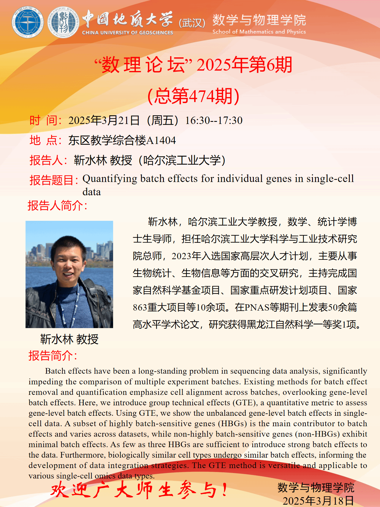 2025年3月21日靳水林教授学术报告:Quantifying batch effects for individual genes in single-cell data