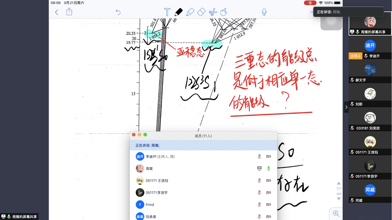 李迪开老师所教的《原子物理》辅修课程,是小班授课,一共只有12名学生,而且是非物理专业的学生,都对物理很感兴趣。原子物理的课程特点是有大量庞杂的知识点,并且这是学生第一次脱离熟悉的经典物理范畴,进入微观物质世界,很多微观物质规律是反直觉的,需要深刻的物理认知能力。以往这类课程,往往需要教师在课堂黑板上进行大量的板书,以阐明公式推导及物理意义,并需要不断跟学生互动,确保学生能够理解并建立物理图像。这对于疫情期间的直播课来说,是个不小的挑战。在新学期伊始,李老师也不确定到底怎样的教学法是最有效的,经过一两周的摸索,李老师尝试将费曼学习法运用于小班教学。费曼学习法指的是,一个人想要学习一种新知识或概念,就在初步学习后,将学到的东西向他人讲授,在讲述过程中,既能加深自己对概念的理解,更能找到自己不明白的知识节点,由此梳理整个知识结构。于是在每次原子物理课前,李老师先将电子版教材,教案,以及Bilibili平台,中国大学MOOC等在线教学视频发布到班级教学QQ群里,给同学们分配任务,每一名或几名同学负责一个小节的“备课”。到了直播课的时候,使用腾讯会议的直播功能,由一名同学向所有同学讲授相应的课程章节。刚开始时,大家都有点不适应这种方法,包括李老师自己心里也没底。有的同学明显准备不充分,就是照着李老师课前发布的课件“念书”。不过李老师马上就发现了一个好的补充方法——提问。讲课的同学,可能对着课件照本宣科地念,但在关键的知识点,李老师会喊停,进行针对性提问“张同学,你刚才说玻尔氢原子轨道解释有不足之处,那么请问你,是哪些不足之处?”,再比如“王同学,你刚才说碱金属原子谱线经过三次分裂,那么是哪三次分裂?”最初这样操作的时候,讲课的同学被问的张口结舌,毕竟像上面关于三次分裂的问题,涉及到前后三章课程的若干个知识点。心理学上人倾向于保持一贯性,也就是要维护自己说出来的话,因此即使学生是仅仅是照着课件念出了某个模糊的概念,当被老师问到的时候,学生的大脑就开始主动思考寻找问题的答案,以便自圆其说。就这么一个让学生备课讲课,再加上老师在直播中现场提问的安排,迅速把老师向学生传授转变成了学生自己要去找到答案。再结合腾讯会议的多人分享屏幕功能,每个学生都充分发挥了各自的聪明才智,利用不同的技术手段向老师同学们展示自己的学习思路。在腾讯会议室中,李老师只是把控进度和关键知识节点的主持人,而学生才是各展其才粉墨登场的主角,充分形成了教师为主导,学生为主体的良性教学互动。